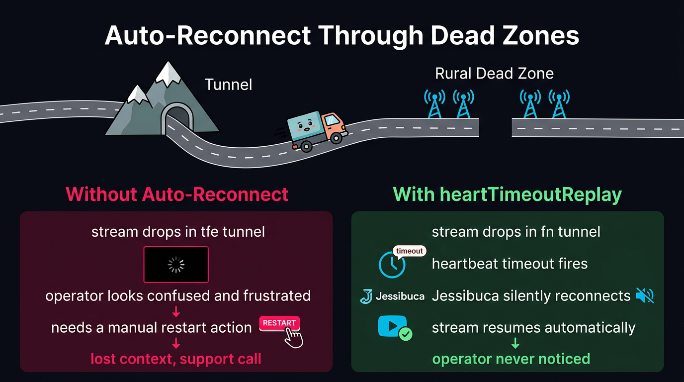 heartTimeoutReplay: true in the Jessibuca config handles the basic case - if the heartbeat fails, the player reconnects automatically. But I needed more control on iOS where WebKit's WebSocket handling is less resilient than Chrome's. I added platform-aware connection monitoring with progressive backoff: