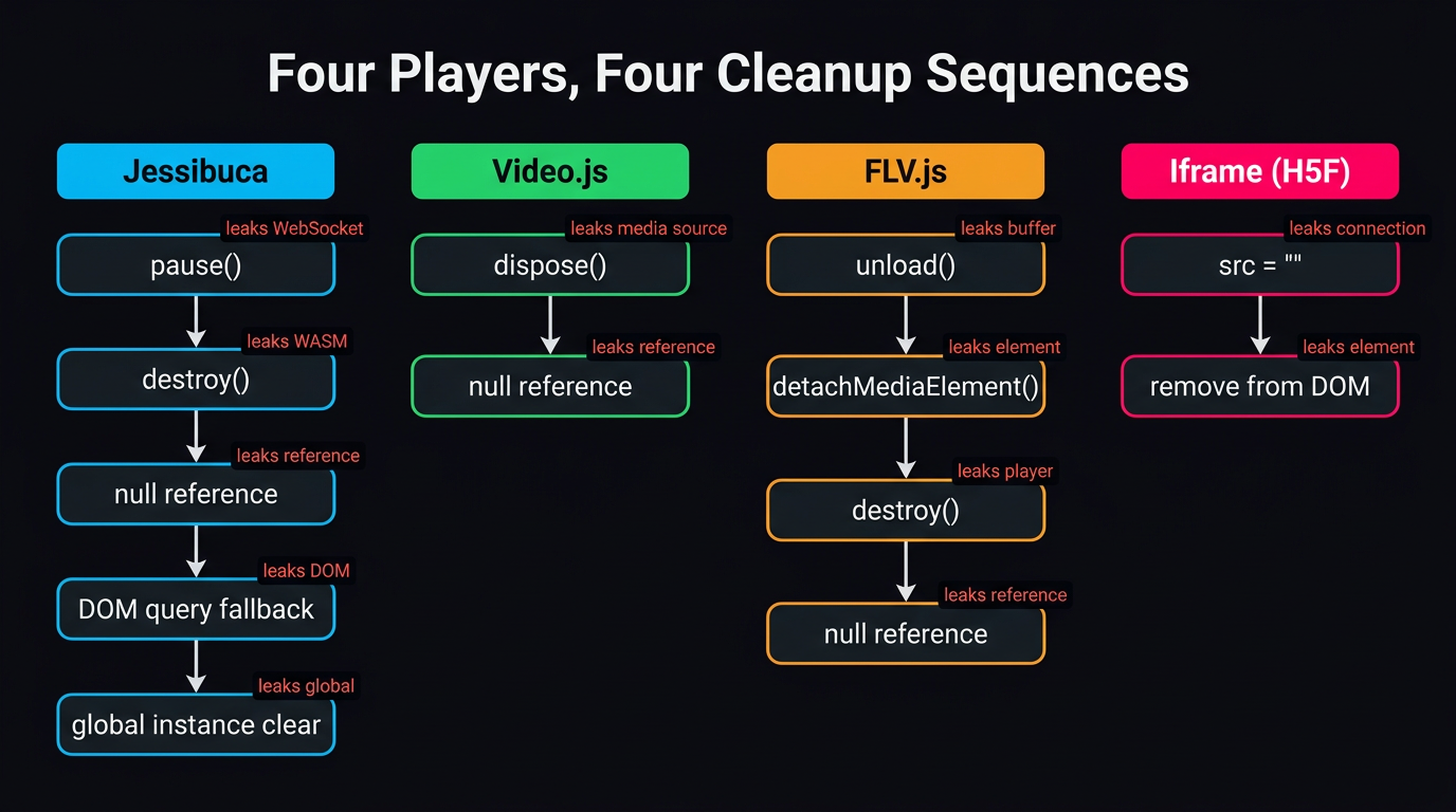 Jessibuca cleanup has three layers specifically because it creates more resources than any other player - WebSocket connections, WASM decoder instances, canvas elements, and global window references:
