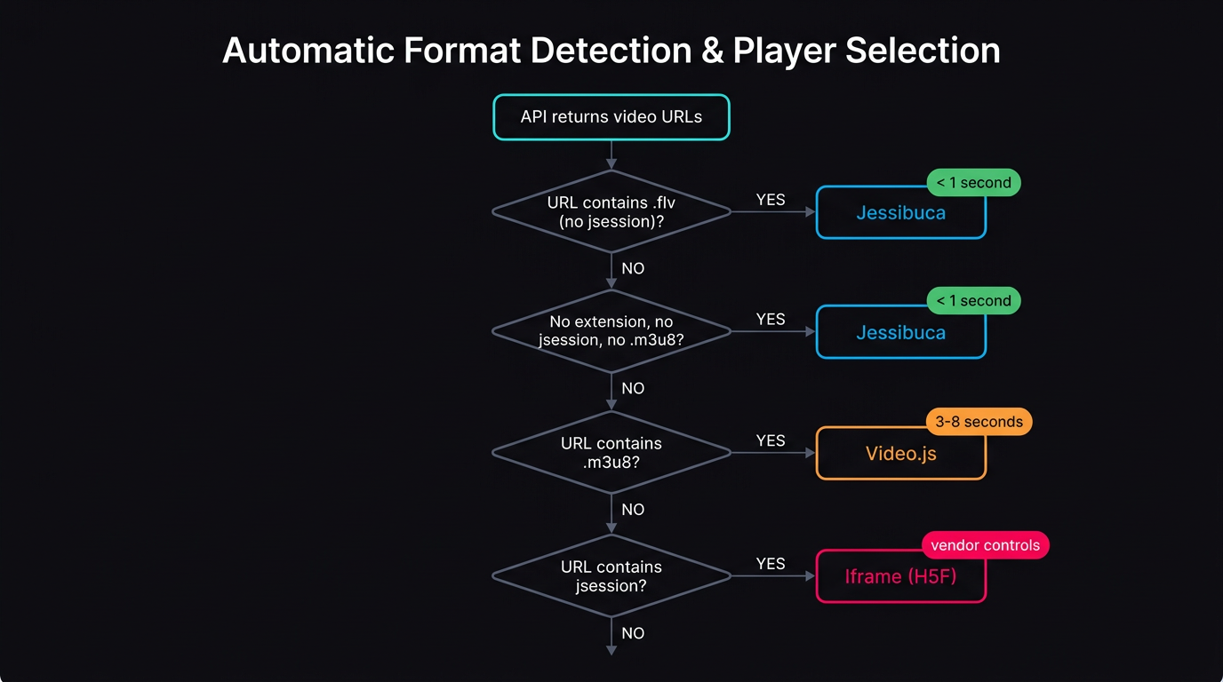Different hardware vendors. Different firmware versions. Different streaming capabilities. One camera outputs FLV over WebSocket. Another provides HLS m3u8 playlists. A third only offers an iframe-based vendor player behind a jsession URL. A fourth uses plain HTTP-FLV with a URL that doesn't even have a file extension.