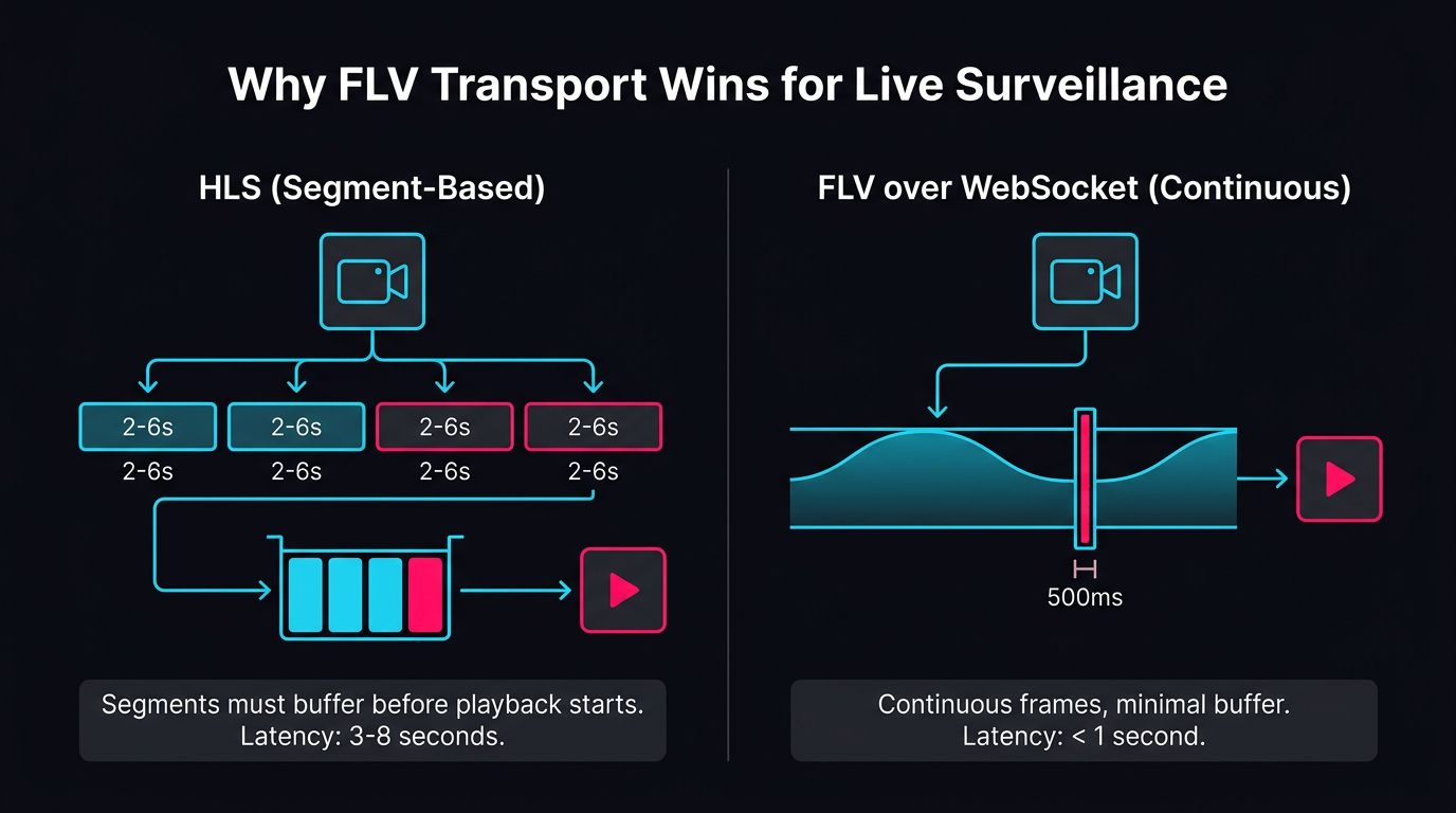 HLS breaks the stream into segments - typically 2–6 seconds each - and buffers several before playback starts. That architecture is great for CDN delivery and reliability. For live surveillance it's fundamentally wrong. I tried everything: lowered segment size, reduced buffer depth, enabled low-latency mode with the full VHS configuration: