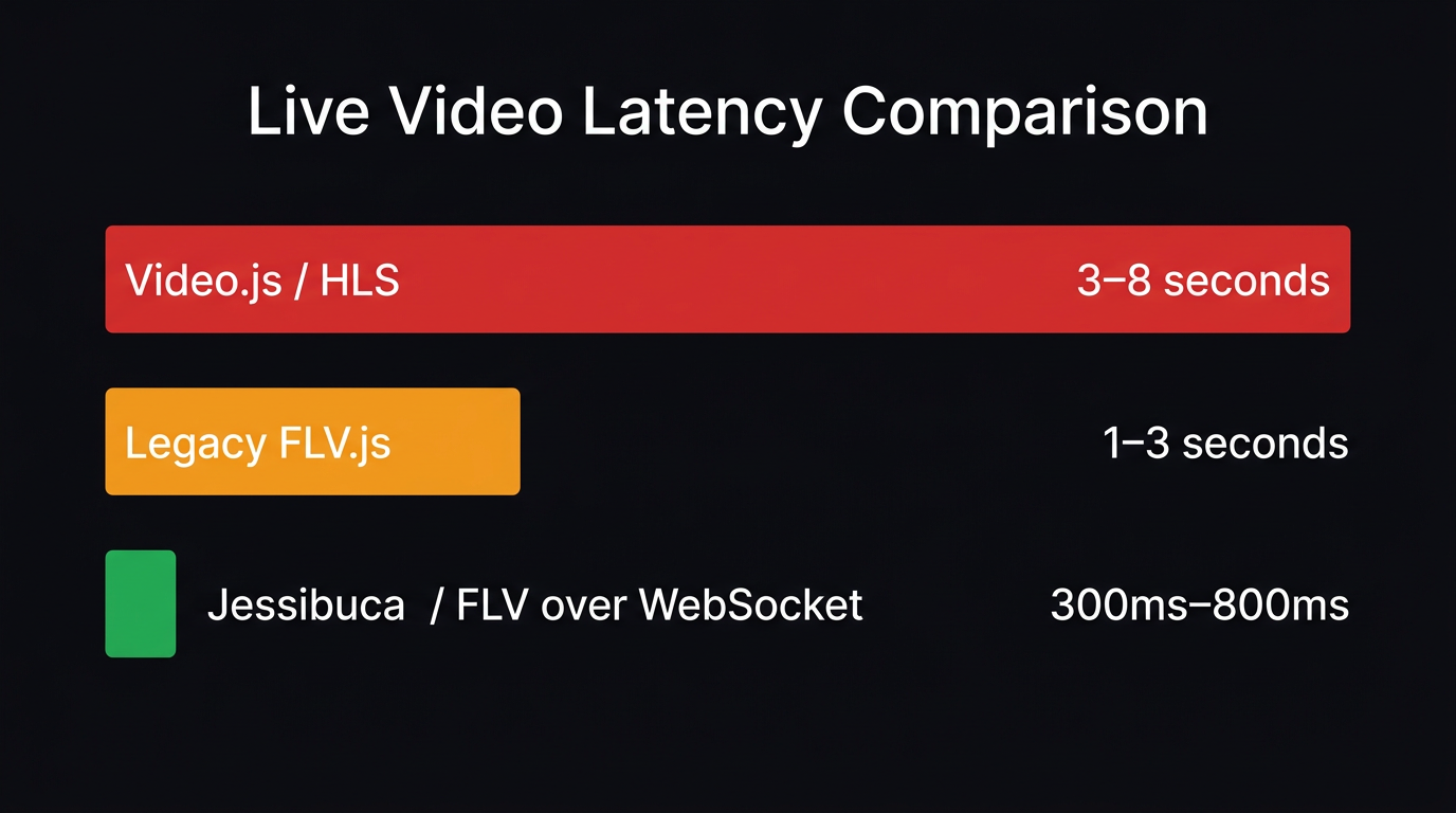 | Jessibuca | FLV over WebSocket | 300ms–800ms |