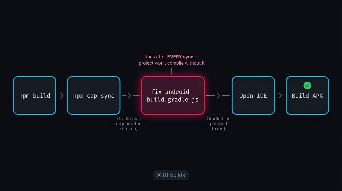 That `fix-android-build.gradle.js` step isn't optional. Every time `npx cap sync` runs, it regenerates the Gradle files for the `capacitor-cordova-android-plugins` module. The generated output has two problems: it's missing the `namespace` declaration that modern Android Gradle Plugin requires, and it includes a `flatDir` repository that causes dependency resolution conflicts. The project won't compile without fixing both.