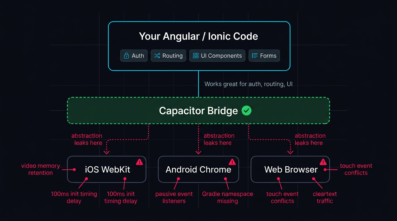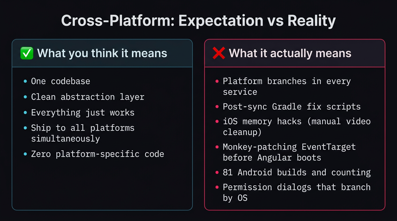 The real value of Ionic/Capacitor isn't the abstraction. It's that when you do find each platform's breaking point, you fix it once and it stays fixed across all 81 subsequent builds. The codebase compounds. Every edge case you solve stays solved.