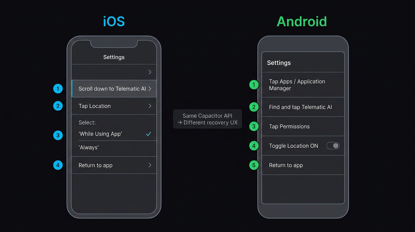 If a driver denies location permission, Capacitor can't re-prompt - the OS blocks it. The app has to send the user to their phone's settings manually. And those settings screens look completely different on iOS vs Android: